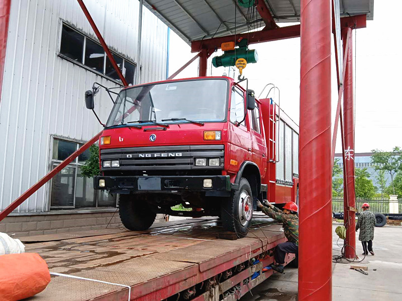 圖片為:兩臺(tái)東風(fēng)救援消防車陸續(xù)開(kāi)上平板車。發(fā)往目的地