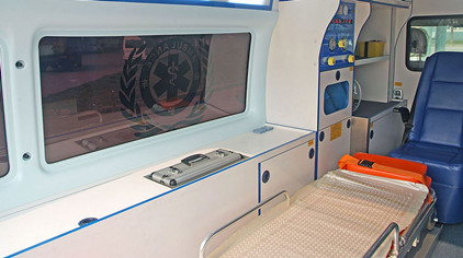 醫療艙內飾具有防腐、防霉、易清洗等特點,便于醫護人員的清潔,整理;座椅均包裹藍色防真皮、車內各面采用圓面設計、造型美觀同時可防止對醫護人員與病患的再次傷害。